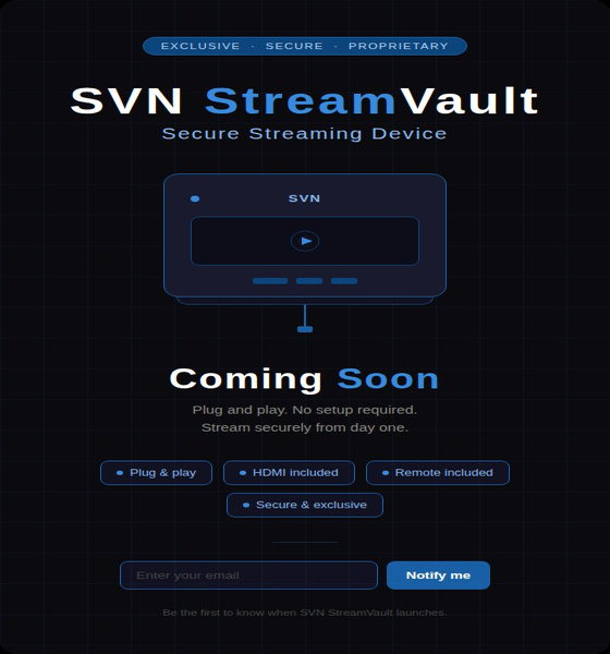 SVN uses an exclusive propertary secure streaming device. The device is a plug and play device. It is simple and easy to install. The device comes with a power cord, hdmi cable and remote. All cables included with the device.